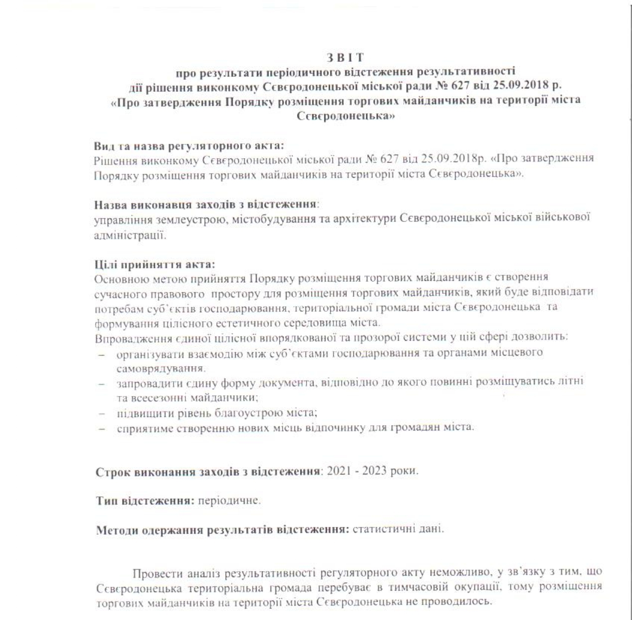 Звіт про результати періодичного відстеження результативності дії регуляторного акта - рішення виконкому Сєвєродонецької міської ради № 627 від 25.09.2018р. «Про затвердження Порядку розміщення торгових майданчиків на території міста Сєвєродонецька»