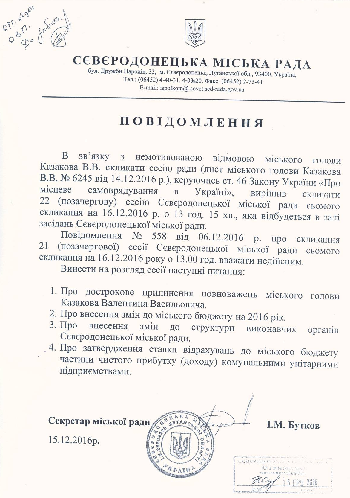 Повідомлення про скликання 22-ї (позачергової) сесії Сєвєродонецької міської ради VII скликання