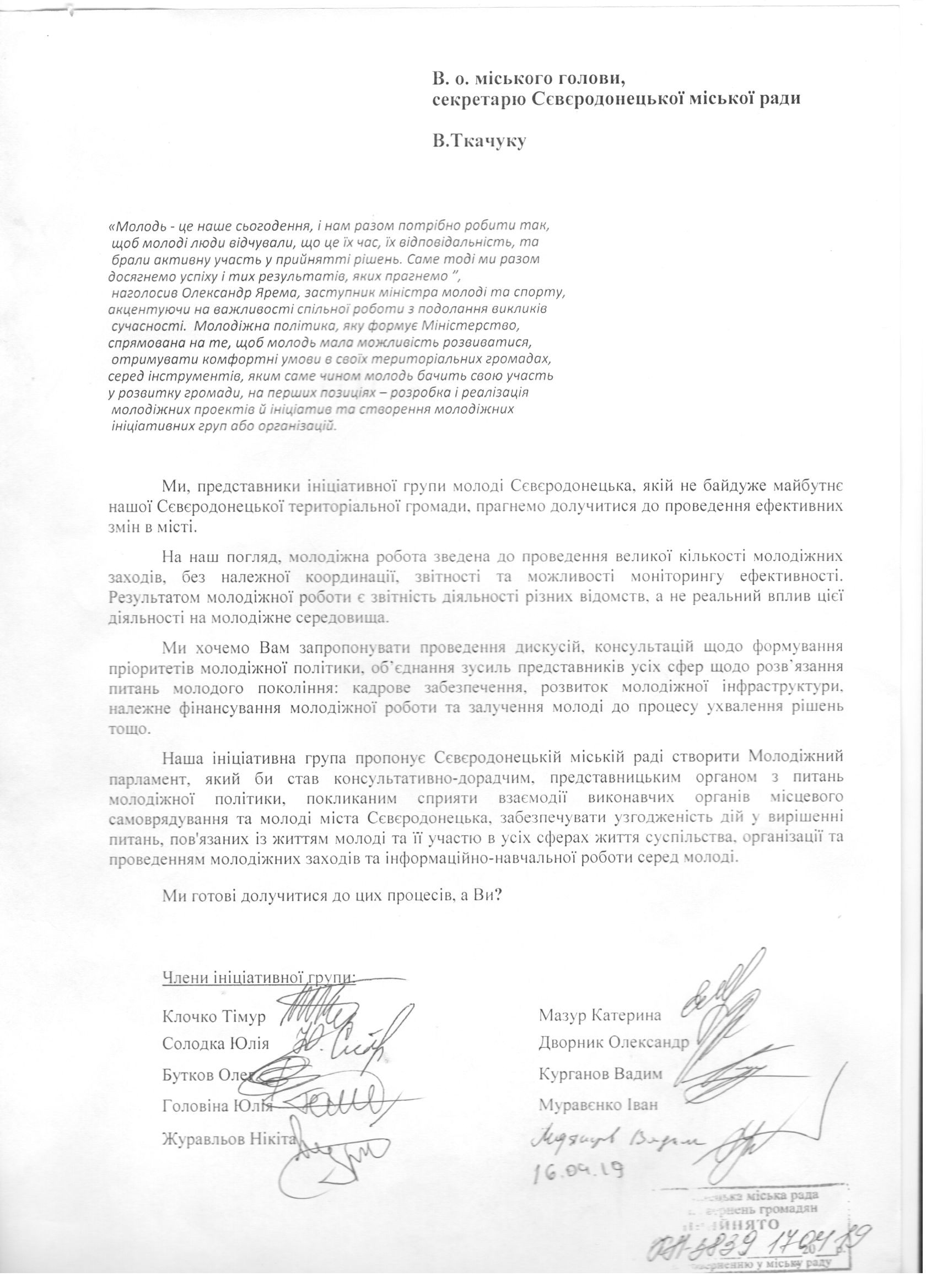 Про звернення ініціативної групи молоді щодо створення Молодіжного парламенту, як консультативно - дорадчої ради з питань молодіжної політики