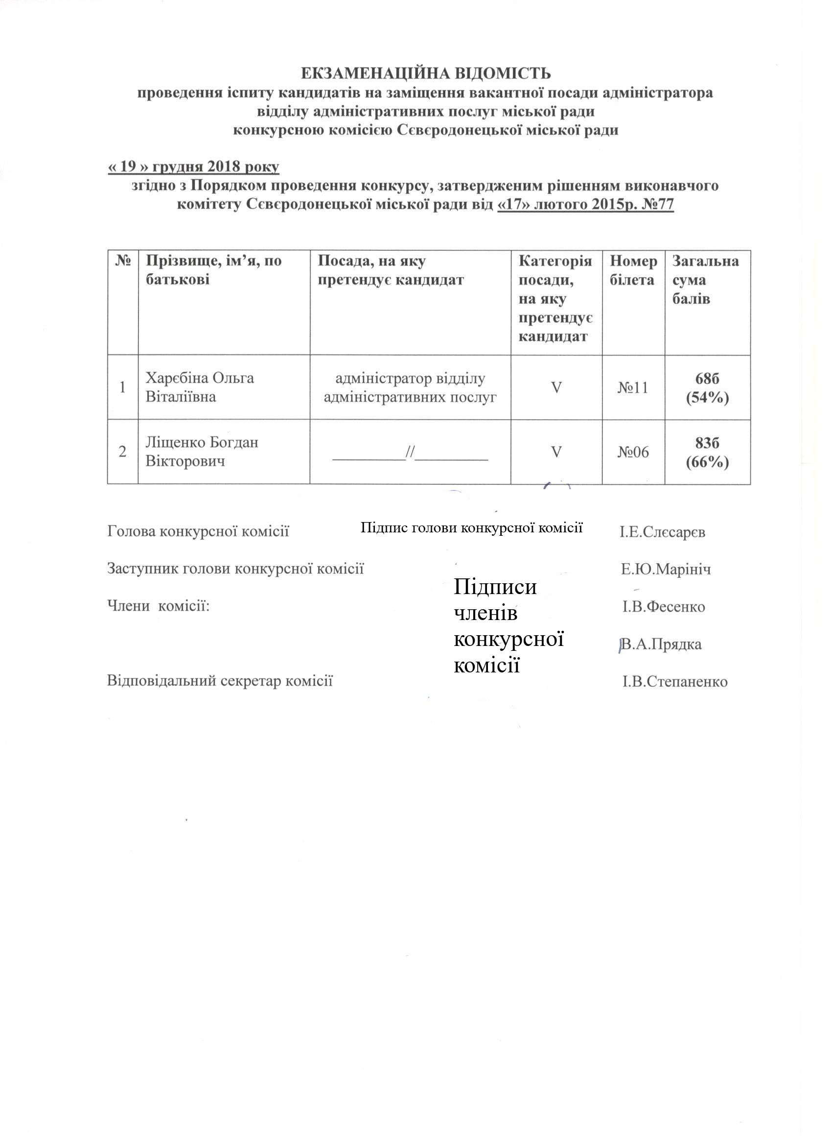 Екзаменаційна відомість до протоколу № 17-1 (адміністратор відділу адміністративних послуг)