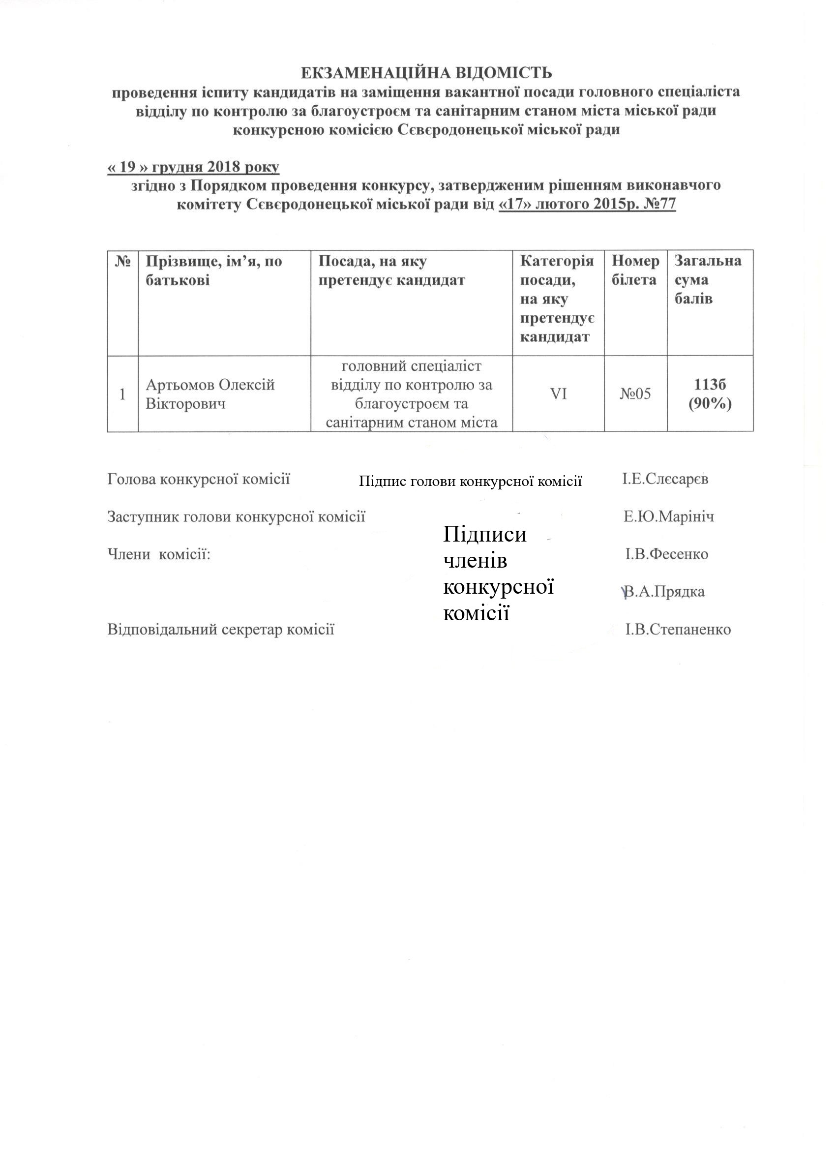Екзаменаційна відомість до протоколу № 17-1 (головний спеціаліст відділу по контролю за благоустроєм та санітарним станом міста)