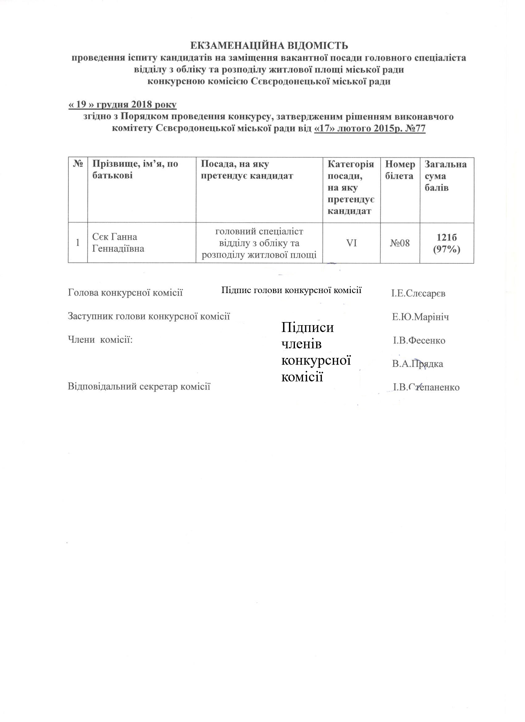 Екзаменаційна відомість до протоколу № 17-1 (головний спеціаліст відділу з обліку та розподілу житлової площі)