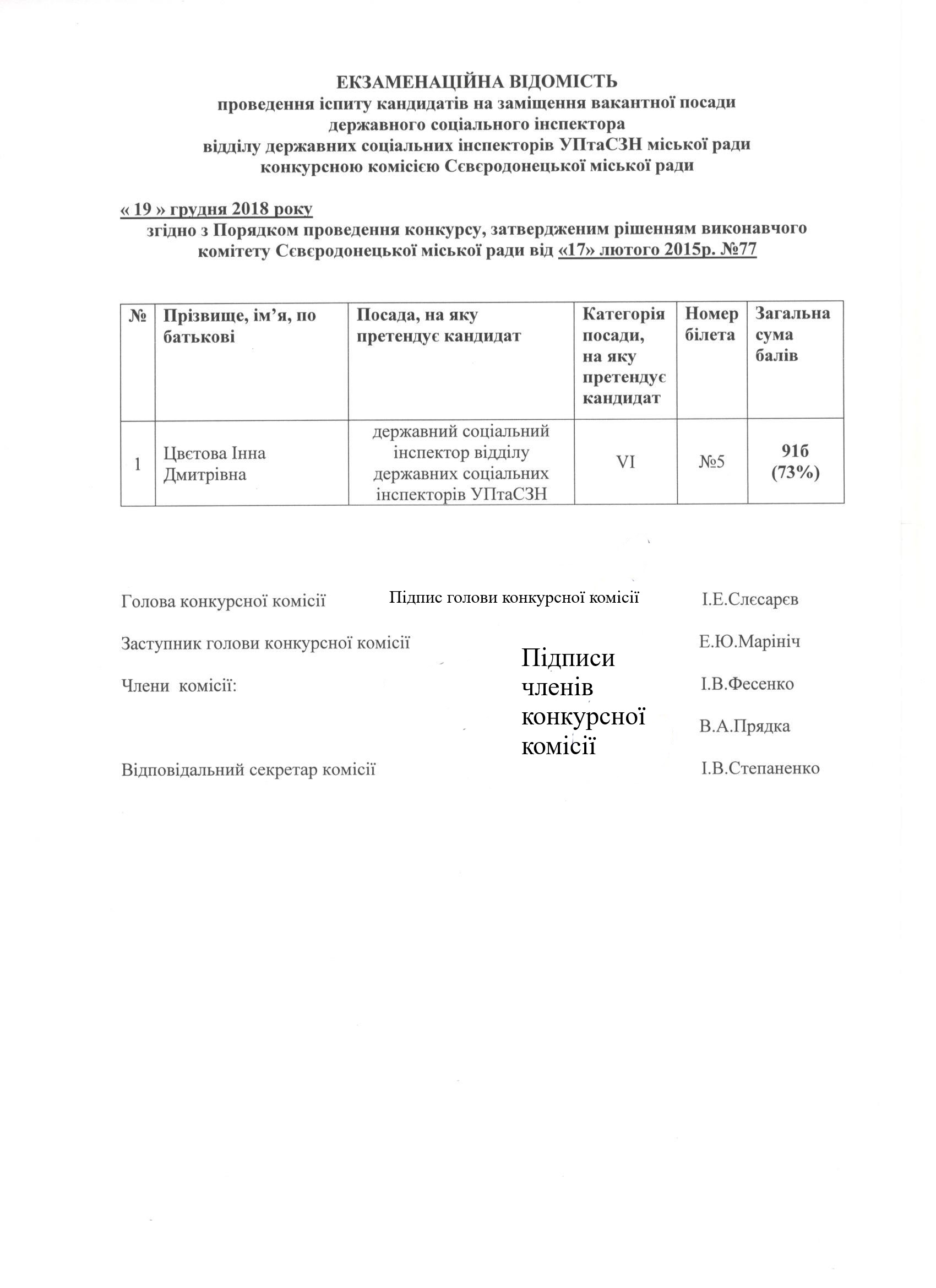 Екзаменаційна відомість до протоколу № 17-2 (спеціаліст 1 категорії УПтаСЗН - постійна)