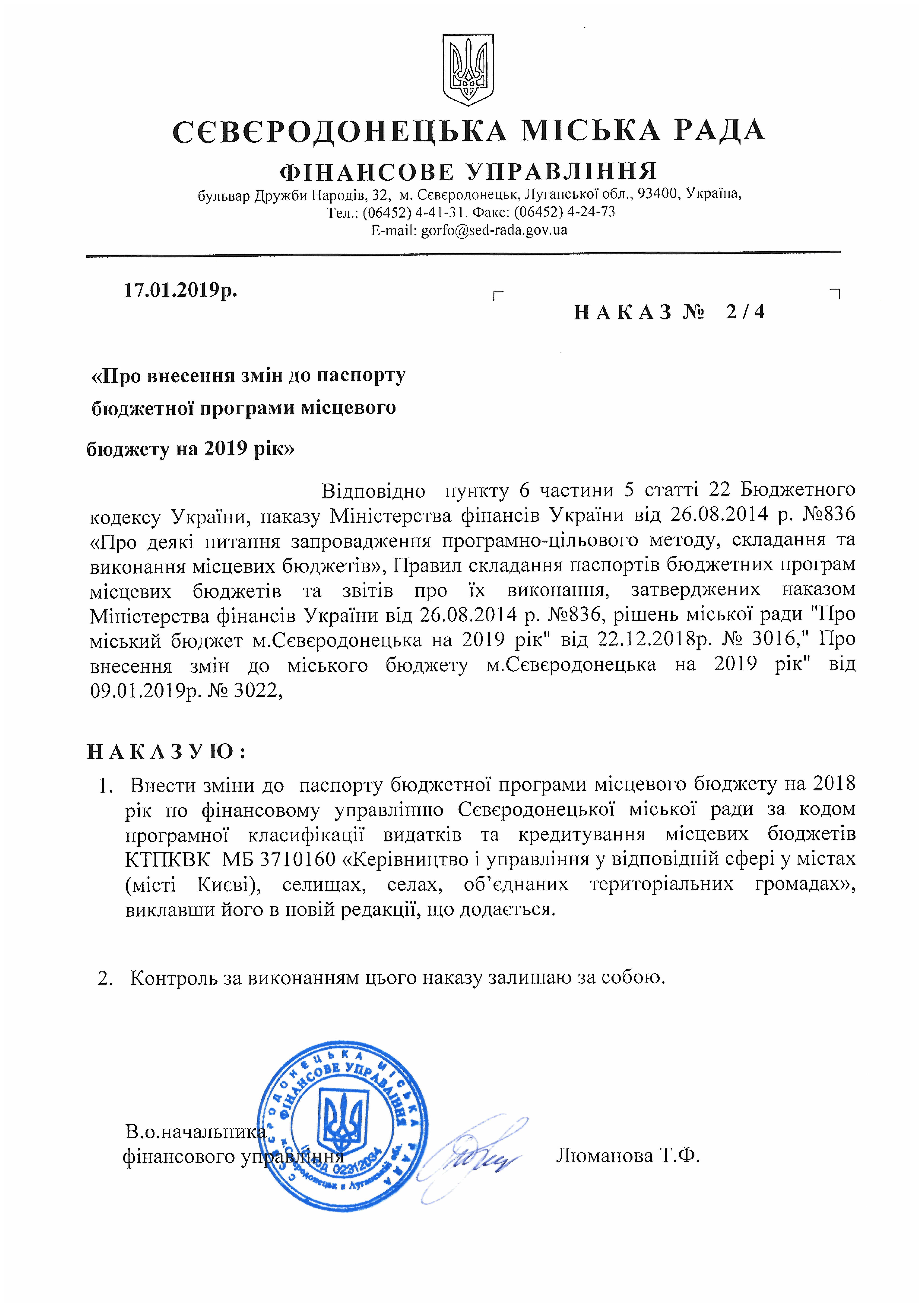Наказ від 17.01.19 року № 2/4