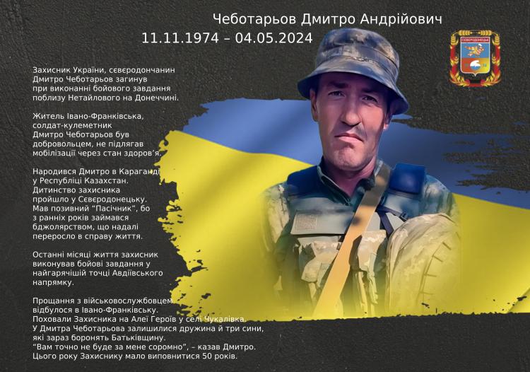 Захисник України, сєвєродончанин Дмитро Чеботарьов (11.11.1974 р.н.) загинув 4 травня 2024 року при виконанні бойового завдання поблизу Нетайлового на Донеччині.