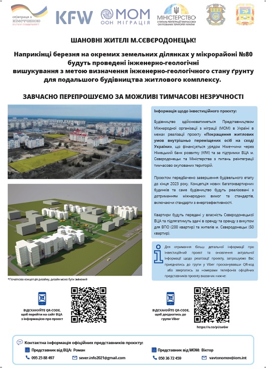 Представництво організації з міграції в Україні за фінансування уряду Німеччини через Німецький банк розвитку (KfW) реалізує у м. Сєвєродонецьку проєкт «Покращення житлових умов внутрішньо переміщених осіб на сході України».