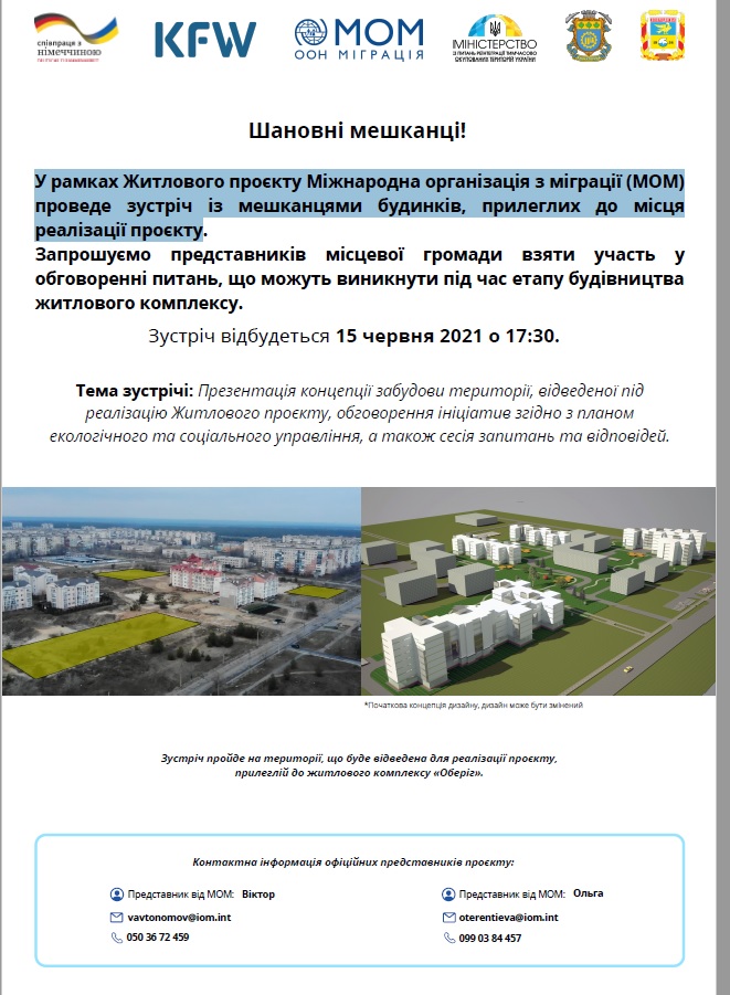 У рамках Житлового проєкту Міжнародна організація з міграції (МОМ) проведе зустріч із мешканцями будинків, прилеглих до місця реалізації проєкту