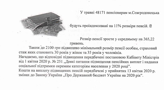 УПФУ інформує: у травні 48171 пенсіонерам м. Сєвєродонецька будуть проіндексовані на 11% розміри пенсій