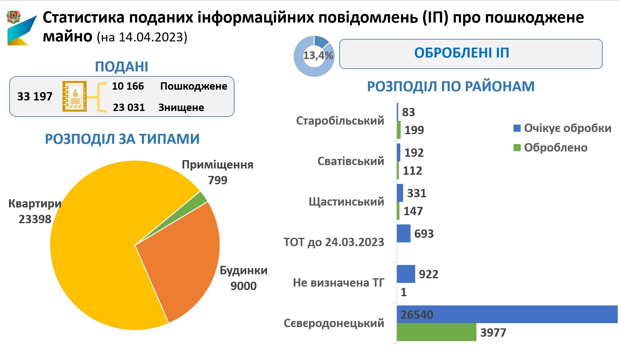 Луганська обласна державна адміністрація повідомляє, що до Державного реєстру майна, пошкодженого та знищеного внаслідок бойових дій, терористичних актів, диверсій, спричинених військовою агресією російської федерації мешканцями області внесено 33 197 інформаційних повідомлень (ІП).