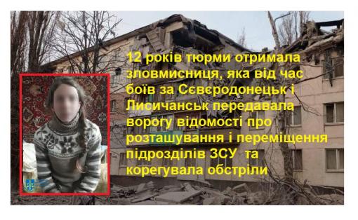 12 років тюрми отримала зловмисниця, яка від час боїв за Сєвєродонецьк і Лисичанськ передавала ворогу відомості про розташування і переміщення підрозділів ЗСУ та корегувала обстріли