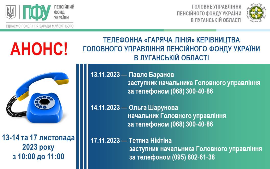 У п’ятницю, 17 листопада, із 10:00 до 11:00 можна звернутися до заступника начальника Головного управління Пенсійного фонду України у Луганській області Тетяни Нікітіної. Телефон: (095) 802-61-38.
