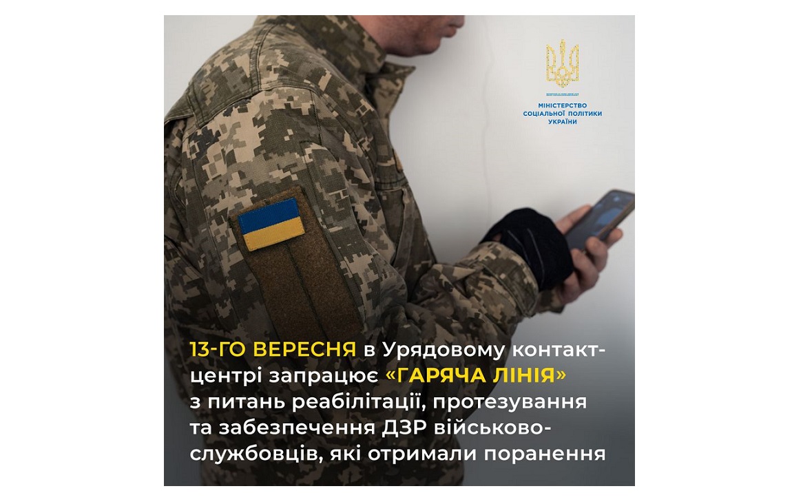 13-го вересня в Урядовому контактному центрі запрацює спеціалізована "гаряча лінія" з питань реабілітації, протезування/ортезування та забезпечення іншими допоміжними засобами реабілітації військовослужбовців, які отримали поранення