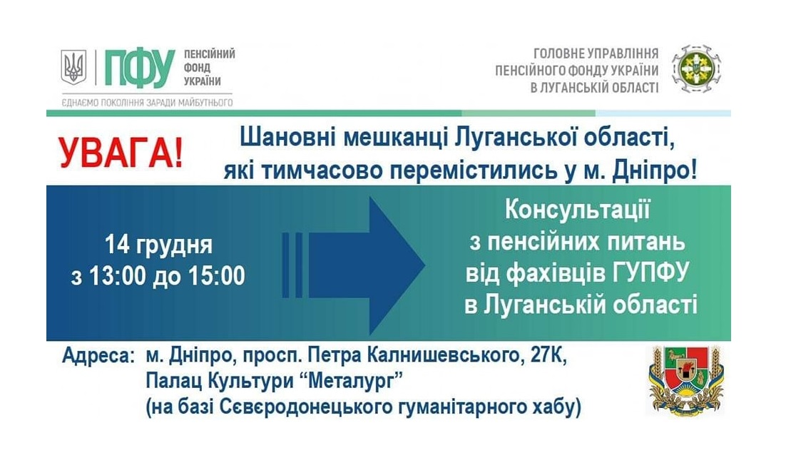 14 грудня в Дніпрі фахівці пенсійного фонду Луганщини проведуть прийом ВПО у Гуманітарному хабі Сєвєродонецької міської військово-цивільної адміністрації.