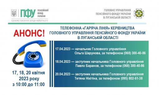 17, 18 та 20 квітня відбудеться «гаряча лінія» керівництва Головного управління Пенсійного фонду України у Луганській області