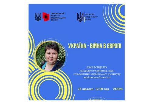 23 лютого о 12:00 Міністерство молоді та спорту спільно з Українським інститутом національної пам’яті проводить онлайн-лекцію "УКРАЇНА - ВІЙНА В ЄВРОПІ"