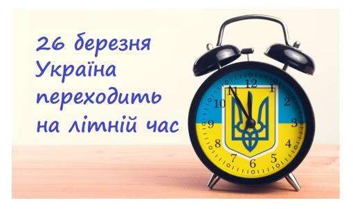 26 березня 2023 року о 3 (третій) годині за київським часом стрілка годинника переводиться на 1 (одну) годину вперед.