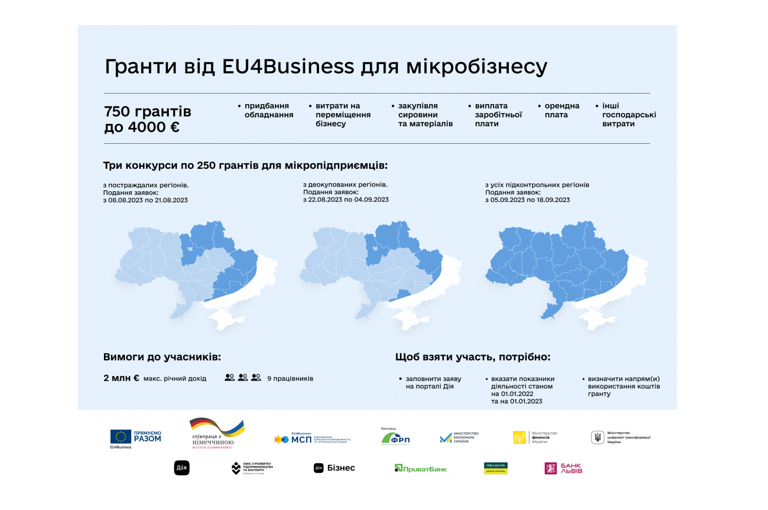 За інформацією: Міністерство цифрової трансформації України - https://thedigital.gov.ua/news/750-ukrainskikh-biznesiv-otrimayut-mikrog... та Міністерство фінансів України - https://mof.gov.ua/uk/news/granti_vid_eu4business_dlia_mikrobiznesu__tse...