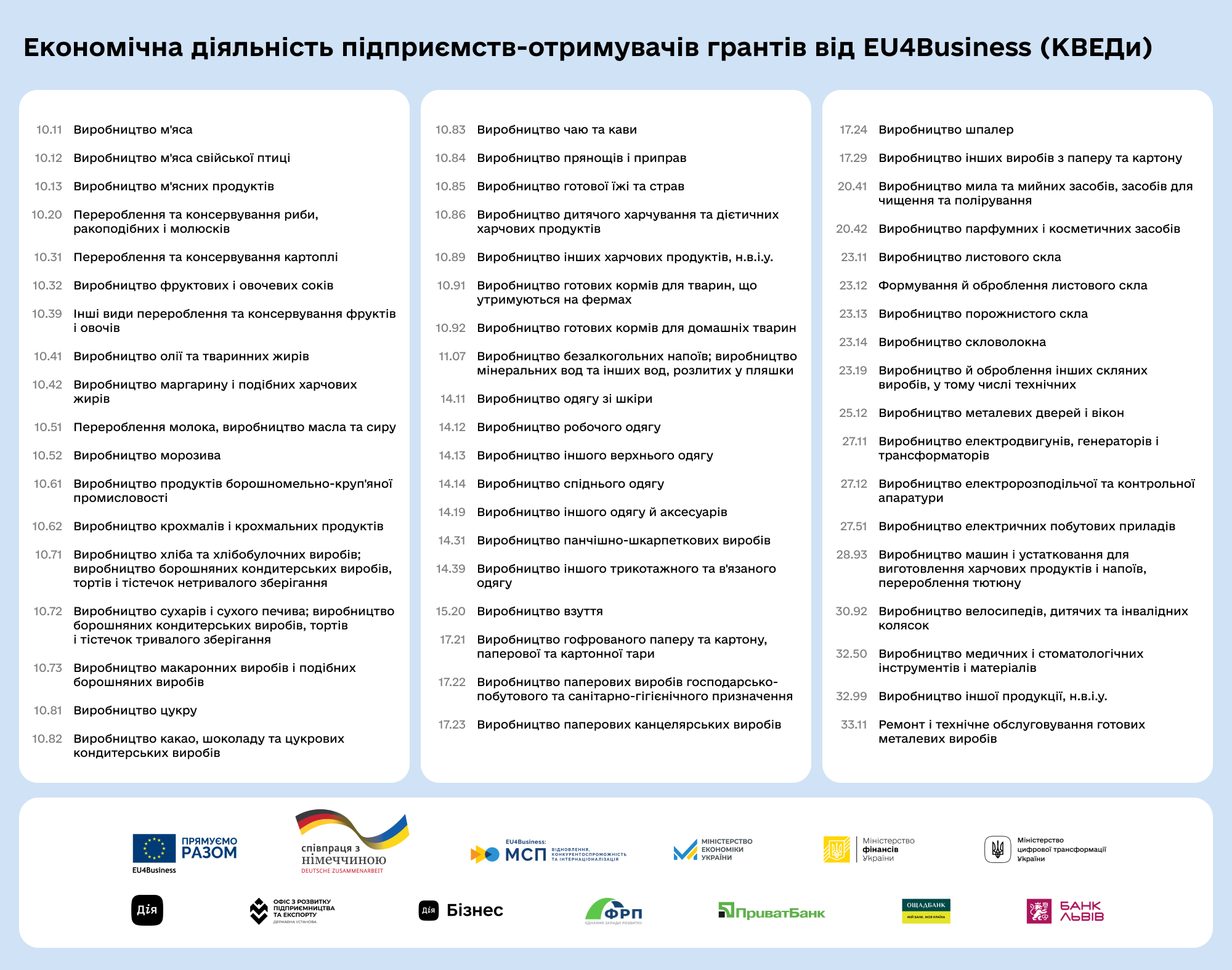 Відбір учасників програми відбуватиметься за результатами конкурсів для таких категорій підприємств: