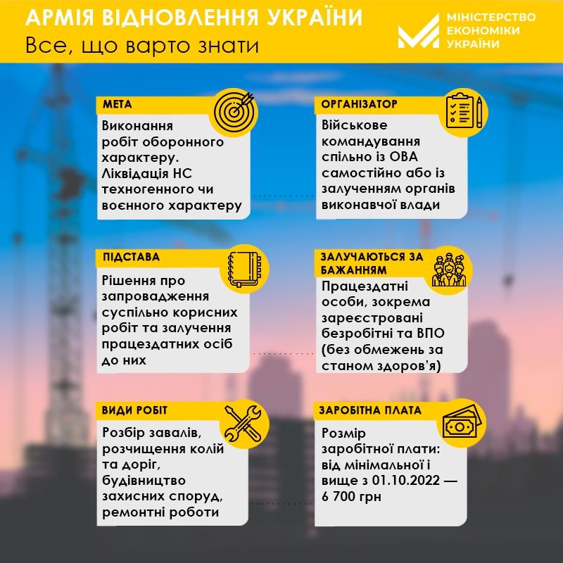 На сьогодні ми маємо дві армії: одна захищає Україну на фронті, інша - працює. І всі ті, хто своєю працею також наближають нашу Перемогу, складають “Армію відновлення”. Люди, які з різних причин залишились зараз без роботи, зможуть долучитись до цієї армії через виконання суспільно корисних робіт з відбудови країни. Причому оплата за такі роботи здійснюватиметься державою на рівні мінімальної зарплати, яка з жовтня складає 6700 грн.