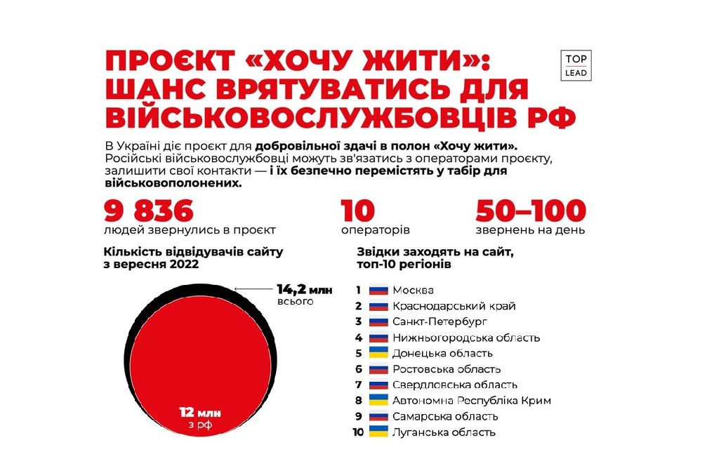 В Координаційному штабі з питань поводження з військовополоненими повідомляють, що до єдиного центру прийому звернень військовослужбовців РФ щодо здачі в полон “Хочу жить” звернулись вже 9836 осіб з росії та тимчасово окупованих територій України.