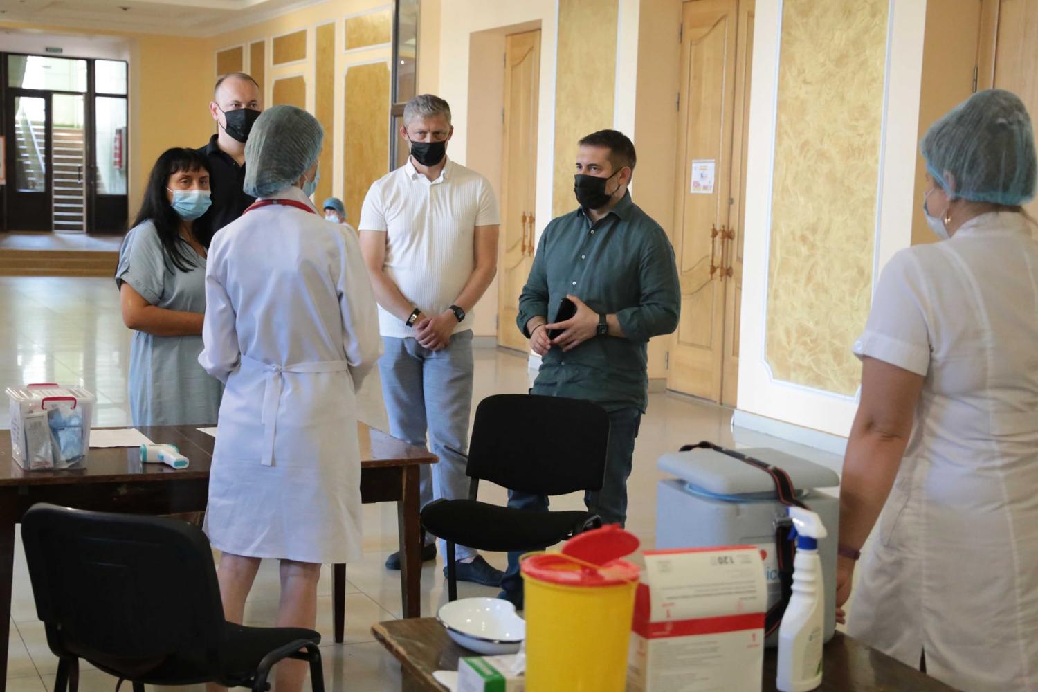 Там він ознайомився з налагодженою роботою медиків та поспілкувався з жителями міста, що прийшли вакцинуватися, і журналістами.