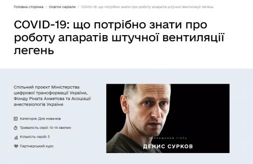 На виконання Програми діяльності Кабінету Міністрів України, затвердженої постановою Кабінету Міністрів України від 29 вересня 2019 року № 849, зокрема, цілі: «Українець, який хоче мати цифрові навички, може їх вільно набути», Міністерство цифрової трансформації запустило національну онлайн-платформу з цифрової грамотності «Дія. Цифрова освіта », яка наразі доступна в мережі Інтернет за посиланням: https://osvita.diia.gov.ua/ . На онлайн-платформі кожен громадянин може безкоштовно опанувати цифрові навички за новим сучасним форматом – освітні серіали. Наразі, на платформі доступний новий онлайн-курс «COVID-19: що потрібно знати про роботу апаратів штучної вентиляції легень ». Оглядовий серіал складається з трьох серій у форматі міні-інтерв’ю. Мета серіалу – розповісти як працюють апарати штучної вентиляції легень, як для лікарів, так і для пацієнтів.