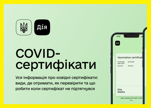 Там можна знайти всю необхідну інформацію про види COVID-сертифікатів, інструкції та необхідні умови для генерування. Також на лендингу розміщені відповіді на найпоширеніші запитання. Наприклад, чому не підтягується сертифікат або що робити, якщо сертифікат зник із застосунку.