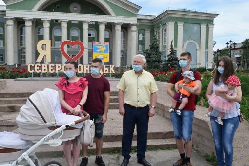 В.о. міського голови Вячеслав Ткачук та заступник міського голови Ірина Степаненко біля візитівки міста - пам’ятного знаку «Я люблю Сєвєродонецьк» - вручили сертифікати на отримання матеріальної допомоги в сумі 10 000 грн. родинам Сергія та Тетяни Латка, Олексія та Марини Хрипун, Дениса та Ольги Гончарових. До речі, у кожній з цих сімей народилося по хлопчику і дівчинці.