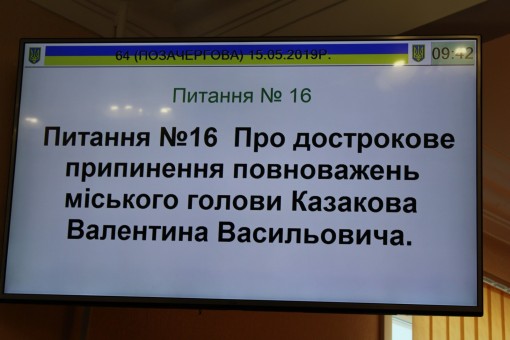 15 травня на 64-й позачерговій сесії Сєвєродонецької міської ради, яка була скликана за ініціативою депутатів рішенням №3694 достроково припинено повноваження міського голови Валентина Казакова з аргументацією: «міський голова систематично порушує права депутатів Сєвєродонецької міської ради, норм Конституції України, Законів України, прав і свобод громадян, не виконує надані йому повноваження, що привело до постійного обурення громади м.Сєвєродонецька та депутатів Сєвєродонецької міської ради».