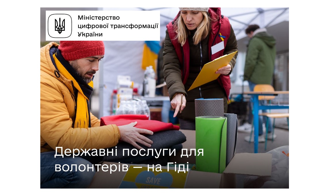 Міністерство цифрової трансформації України пропонує добірку послуг на Гіді з державних послуг, які стануть корисними для волонтерів, або тих, хто має бажання приєднатись до добрих справ: