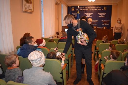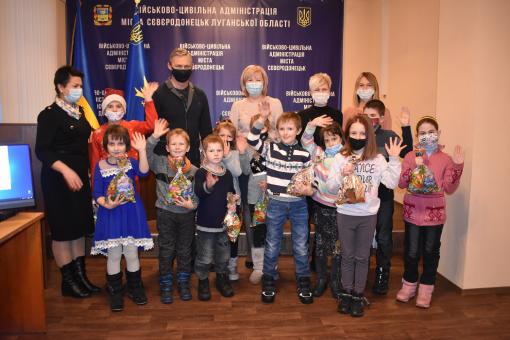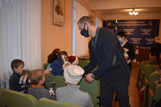 Для дітей з багатодітних малозабезпечених родин та з багатодітних родин, в яких п’ятеро і більше дітей, 18 грудня військово-цивільна адміністрація м. Сєвєродонецьк, Управління праці та соціального захисту населення організували святкову зустріч у рамках міської цільової програми «Турбота».