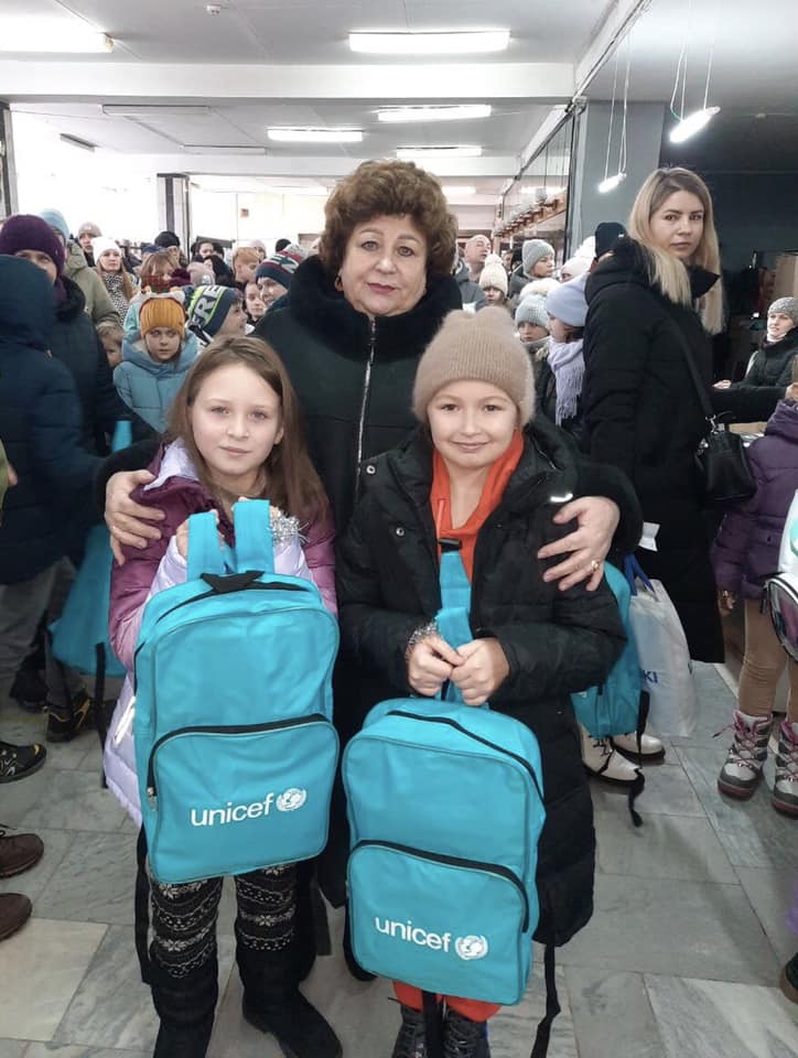 Поки малеча насолоджувалась вмістом рюкзаків, матусі отримали по набору побутової хімії від UNICEF.