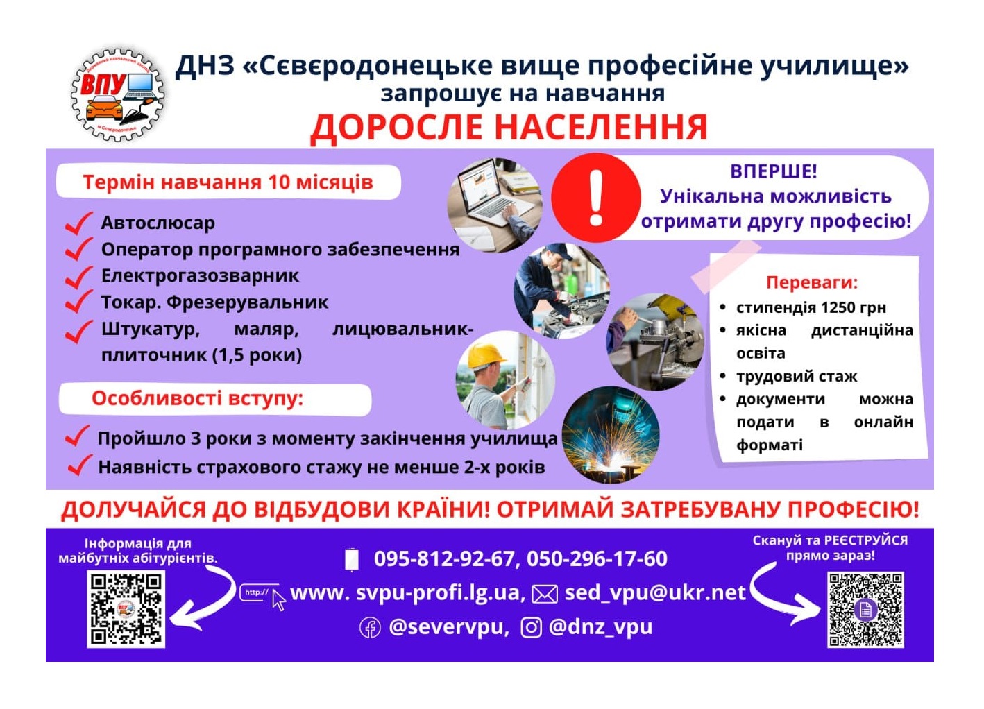 ДНЗ "Сєвєродонецьке ВПУ" запрошує на навчання доросле населення