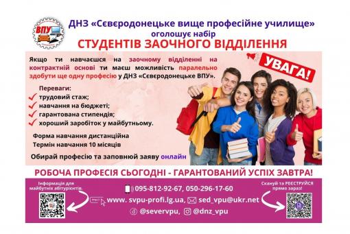 ДНЗ "Сєвєродонецьке ВПУ" запрошує опанувати нові професії тих, хто вже навчається на заочному відділенні на контрактній основі