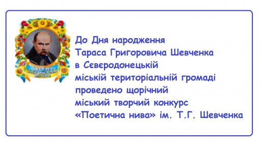 Згідно з Планом заходів національно-патріотичного виховання на 2022-2023 навчальний рік Управління освіти Сєвєродонецької міської військово-цивільної адміністрації, з метою відродження культурної спадщини та національних традицій українського народу, заглиблення у творчість Тараса Григоровича Шевченка, популяризації її серед дітей і юнацтва, до Дня народження Кобзаря проведено щорічний міський творчий конкурс «Поетична нива» ім. Т.Г. Шевченка (далі- Конкурс).