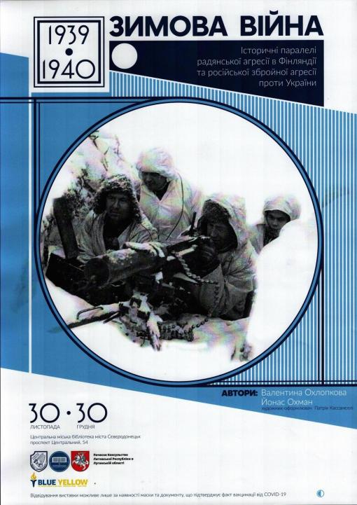 З 30 листопада по 30 грудня в Центральній міській бібліотеці міста Сєвєродонецьк (проспект Центральний, 54) проходить виставка «ЗИМОВА ВІЙНА 1939-1940: історичні паралелі радянської агресії в Фінляндії та російської збройної агресії проти України»* (автори Валентина Охлопкова та Йонас Охман, художник оформлювач Патрік Кассанеллі).