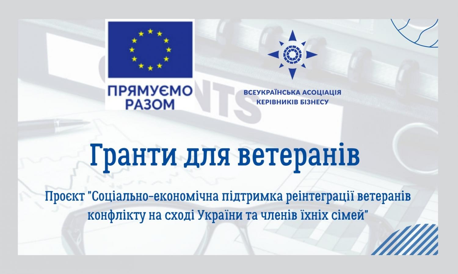 Всеукраїнська Асоціація Керівників Бізнесу в рамках проєкту «Соціально-економічна підтримка реінтеграції ветеранів конфлікту на сході України та членів їхніх сімей», що фінансується Європейським Союзом, оголошує набір зацікавлених ветеранів АТО/ООС до участі в компоненті проєкту щодо розбудови спроможності із започаткування та розвитку бізнесу з можливістю отримання грантової допомоги у вигляді обладнання.