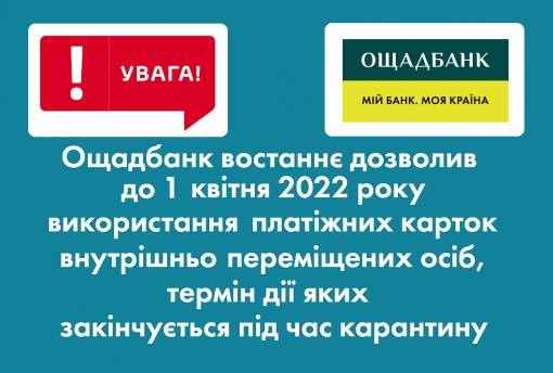 Згідно заяви АТ “Державний ощадний банк України”, надається остання можливість (до 01 квітня 2022 року) використання платіжних карток внутрішньо переміщених осіб, термін дії яких закінчився під час карантину (до 31.03.2021 року) (https://cutt.ly/DYVT7S9 )
