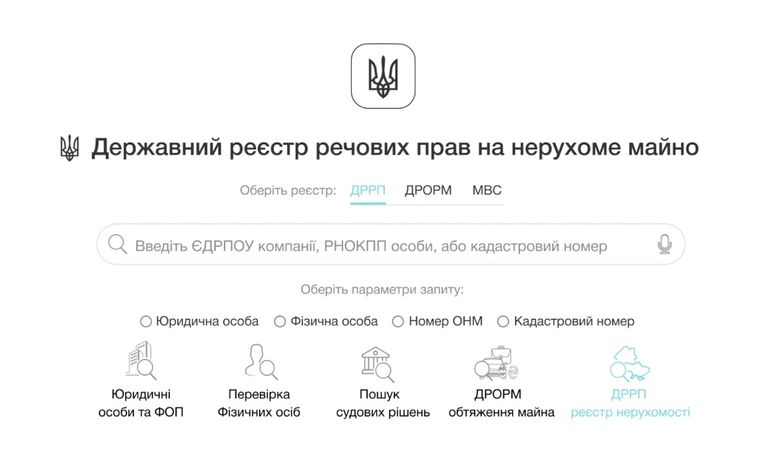- заповніть онлайн-форму із зазначенням критерію пошуку – прізвище та ім'я, серія і номер паспорта, адреса майна, реєстраційний номер, кадастровий номер, за яким бажаєте отримати відомості з Державного реєстру речових прав на нерухоме майно;