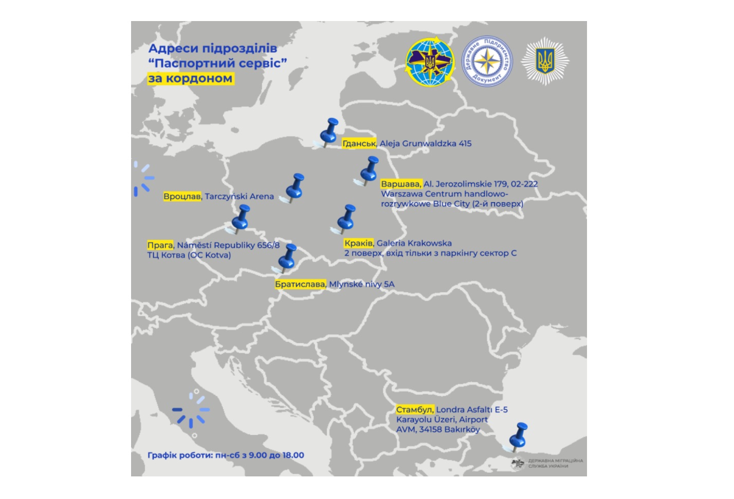 За кордоном відвідати підрозділи «Паспортного сервісу» можна за вказаними нижче адресами: