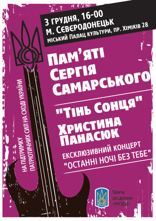 3 грудня о 16:00 у великій залі міського Палацу культури відбудеться ексклюзивний концерт групи «Тінь Сонця» та Христини Панасюк «Останні ночі без тебе», присвячений пам’яті Сергія Самарського. Вхід на концерт за запрошеннями. Запрошення можна отримати безкоштовно у Міському Палаці культури (з 09:00 до 19:00). Тел.: 4-10-43.