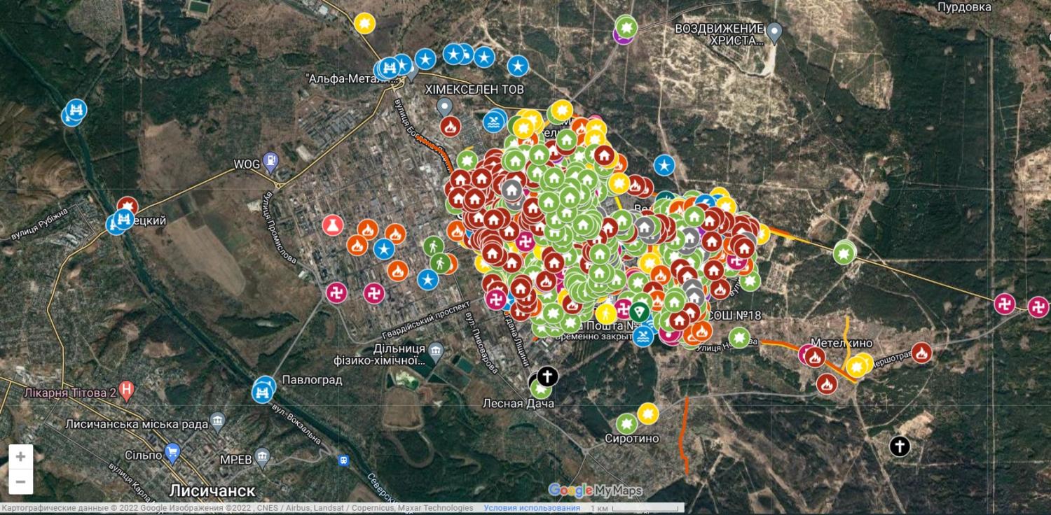 Пряма мова: "Мета карти - показати масштаби злочинів зомбаків (російської армії) в Сєвєродонецьку у 2022 році.