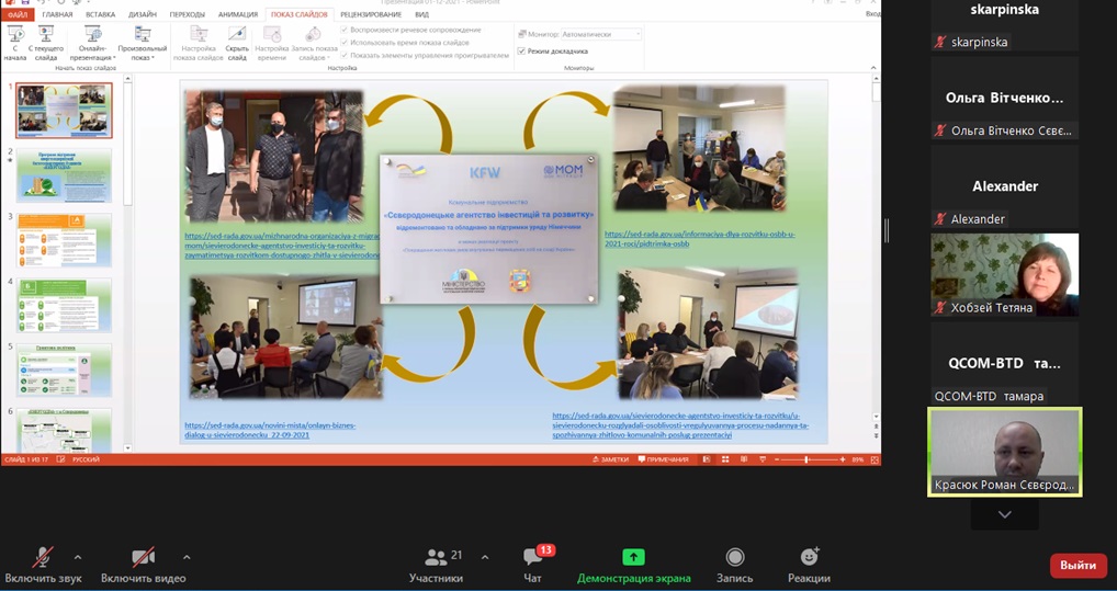 Директор комунального підприємства «Сєвєродонецьке агентство інвестицій та розвитку» Роман Красюк виступав на Форумі в якості спікера в панельній дискусії «Міські програми розвитку ОСББ». Він зазначив: «Щороку в Сєвєродонецьку ми розробляємо та затверджуємо загальноміські програми підтримки ОСББ за кошти місцевих бюджетів, допомагаємо ОСББ на умовах співфінансування виконувати поетапний капітальний ремонт конструктивних елементів або технічних систем будинків. У листопаді 2021 року керівник Сєвєродонецької МВЦА підписав ряд міських програм: «Тепла оселя на 2022 рік», «Програма підтримки ОСББ та співвласників з іншими формами управління багатоквартирними будинками у м. Сєвєродонецьк» та «Затишний двір» на 2022 рік».