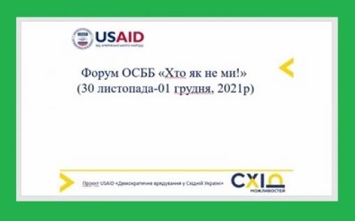 30 листопада та 1 грудня 2021 року проєкт USAID «Демократичне врядування у Східній Україні» провів Форум ОСББ «Хто як не ми?!» для представників об’єднань співвласників багатоквартирних будинків з Донецької, Луганської та Херсонської областей. Протягом двох днів учасники ділились своїми враженнями та особистими історіями успіху, новими тенденціями в управлінні ОСББ. А ще - новим поглядом на облік в ОСББ, викликами, з якими стикаються ОСББ зараз і які успішно подолали, а також факторами мотивації та демотивації у професійному житті. Розглянули також програми підтримки ОСББ, що фінансуються з місцевих бюджетів, на прикладі Сєвєродонецька, Івано-Франківська, Львова, та Новоград-Волинського.