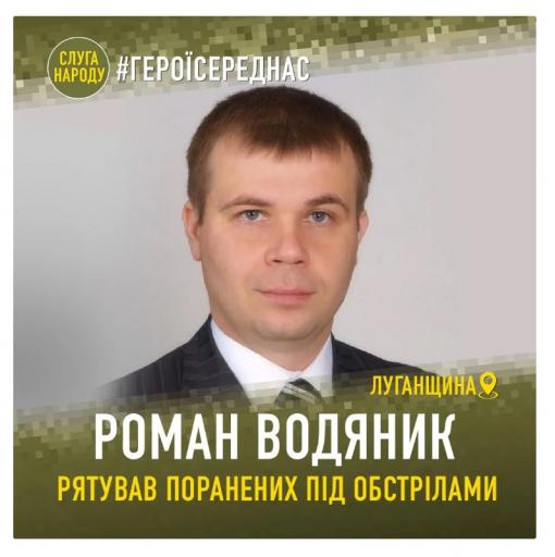 Навіть під час під час жахливих обстрілів і гуманітарної катастрофи на Луганщині головний лікар Сєвєродонецької лікарні та голова фракції «Слуги Народу» у районній раді Роман Водяник залишався у місті - повідомляє ]]>ПП "Слуга народу"]]>. Рятував поранених, допомагав місцевим жителям й військовим. Під час одного з виїздів він потрапив під ворожий обстріл – автівка була вщент знищена, а Роман отримав контузію. Проте продовжив лікувати людей.