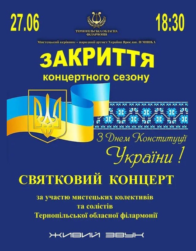 27 червня 2023 року о 18:30 Гуманітарний хаб Сєвєродонецької міської військової адміністрації у місті Тернопіль запрошує ВПО з Луганщини на святковий концерт до Дня Конституції України, який відбудеться в Тернопільській обласній філармонії.