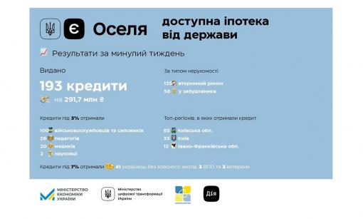 Зокрема, минулого тижня українці отримали за програмою єОселя 193 кредити, серед яких: