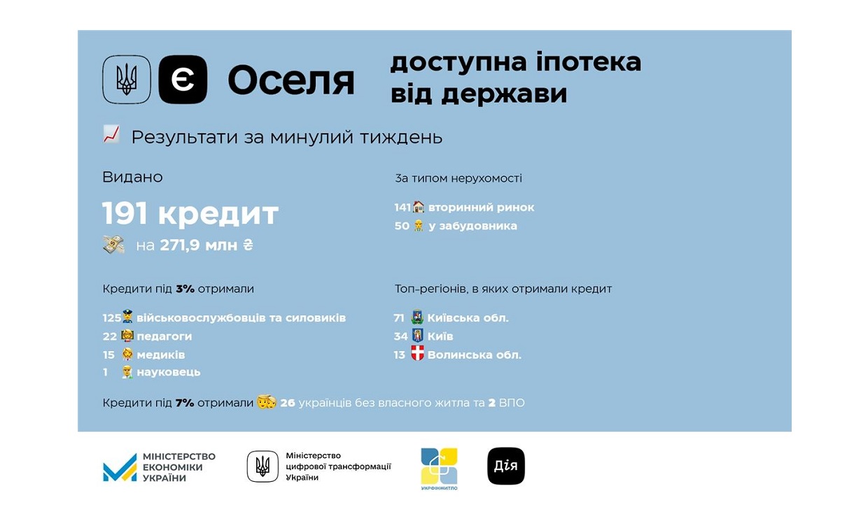 Зокрема, минулого тижня українці отримали за програмою єОселя 191 кредит, серед яких: