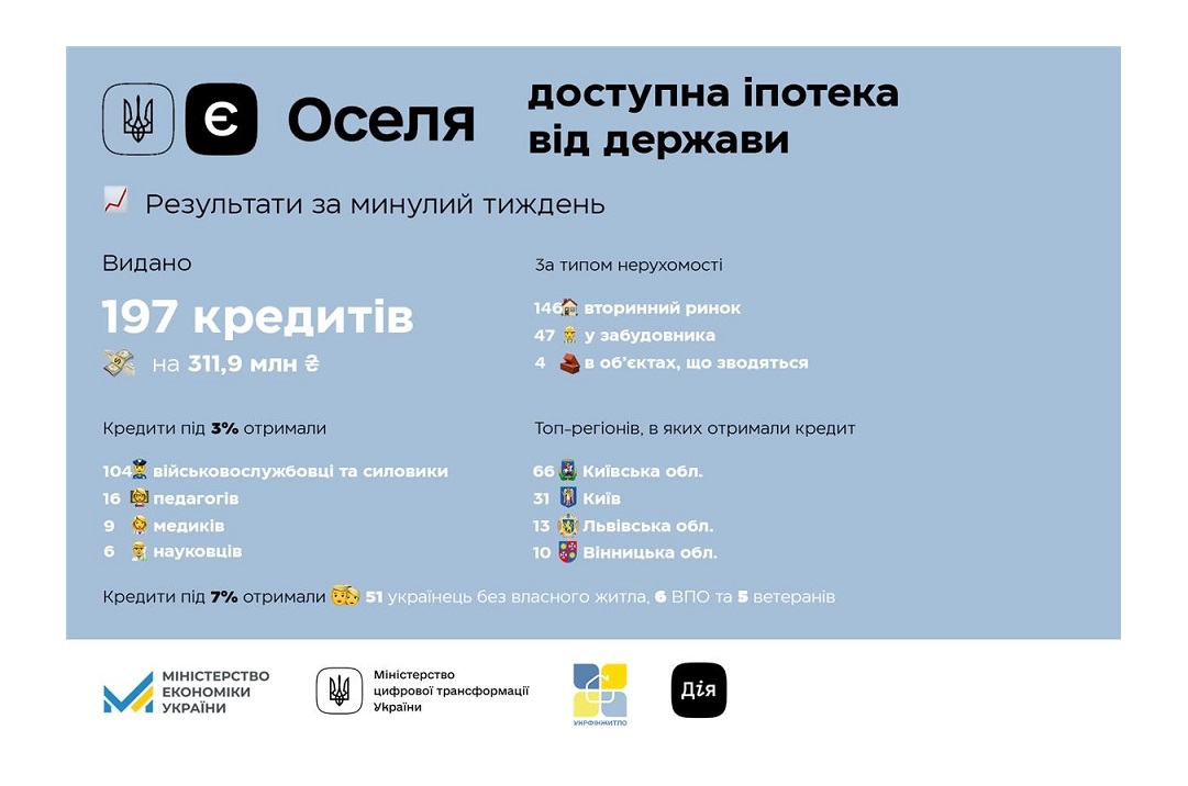 Зокрема, минулого тижня українці отримали за програмою єОселя 197 кредитів на 312 млн грн, серед яких: