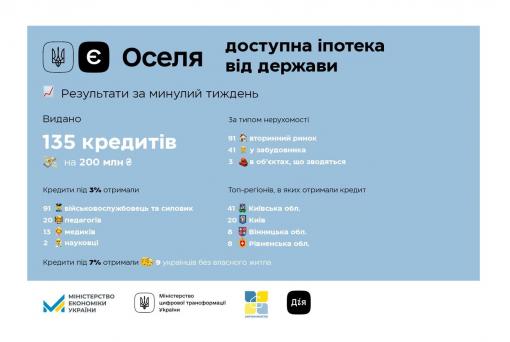 Зокрема, минулого тижня українці отримали за програмою єОселя 135 кредитів, серед яких: